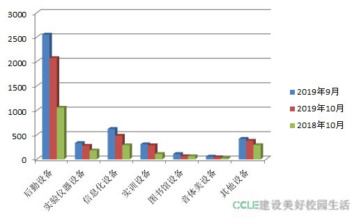 10月份各類別教育裝備招標(biāo)采購信息量對比情況如上圖所示:后勤設(shè)備招標(biāo)采購信息環(huán)比下降18.86%,同比增長96.02%;實(shí)訓(xùn)設(shè)備招標(biāo)采購信息環(huán)比下降6.84%,同比增長160.00%;實(shí)驗(yàn)儀器設(shè)備招標(biāo)采購信息環(huán)比下降16.27%,同比增長54.44%;信息化設(shè)備招標(biāo)采購信息環(huán)比下降22.22%,同比增長67.13%;音體美設(shè)備招標(biāo)采購信息環(huán)比下降24.56%,同比增長79.17%;圖書館設(shè)備招標(biāo)采購信息環(huán)比下降43.64%;其他設(shè)備招標(biāo)采購信息環(huán)比下降9.09%,同比增長30.14%。