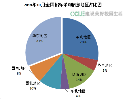 從10月招標(biāo)采購信息地區(qū)統(tǒng)計(jì)圖和全國招標(biāo)采購信息量地區(qū)占比圖可以看出:華東地區(qū)招標(biāo)采購信息量為1112條,占比31%;華北地區(qū)招標(biāo)采購信息量為1017條,占比28%;華南地區(qū)招標(biāo)信息采購量為526條,占比14%;西北地區(qū)招標(biāo)采購信息量為380條,占比10%;西南地區(qū)招標(biāo)采購信息量為275條,占比8%;華中地區(qū)招標(biāo)采購信息量為175條,占比5%;東北地區(qū)招標(biāo)采購信息量為137條,占比4%。