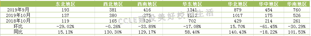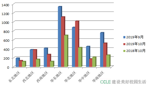 地區(qū)數(shù)據(jù)結(jié)果表明:10月份各地區(qū)招標(biāo)采購信息量與去年同期相比,除華中地區(qū)外,其他地區(qū)均呈現(xiàn)大幅增長趨勢,與上月相比,除華北地區(qū),其他地區(qū)均有不同程度的下降。省份當(dāng)中,河北、北京,廣東、福建、山東等省份的招標(biāo)采購信息量較高。地區(qū)數(shù)據(jù)的不同主要由來自地區(qū)經(jīng)濟(jì)、教育政策、教育投入等因素的影響。