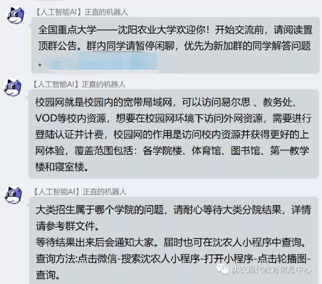 官方的新生群都是實名制入群,群號隨錄取通知書下發(fā)。新生加群在驗證消息中輸入考生號后由機器人自動審核,進群后自動修改群名片,確保每一位群成員都已在群中實名備份。與此同時,現(xiàn)在學(xué)校各個學(xué)院的新生群也陸續(xù)有了沈陽農(nóng)業(yè)大學(xué)機器人的身影,有了它的幫助我們能保證每個人都是實名入群的,保障了群內(nèi)成員信息的安全性,也一定程度上幫助了各個學(xué)院的老師對于群的管理。