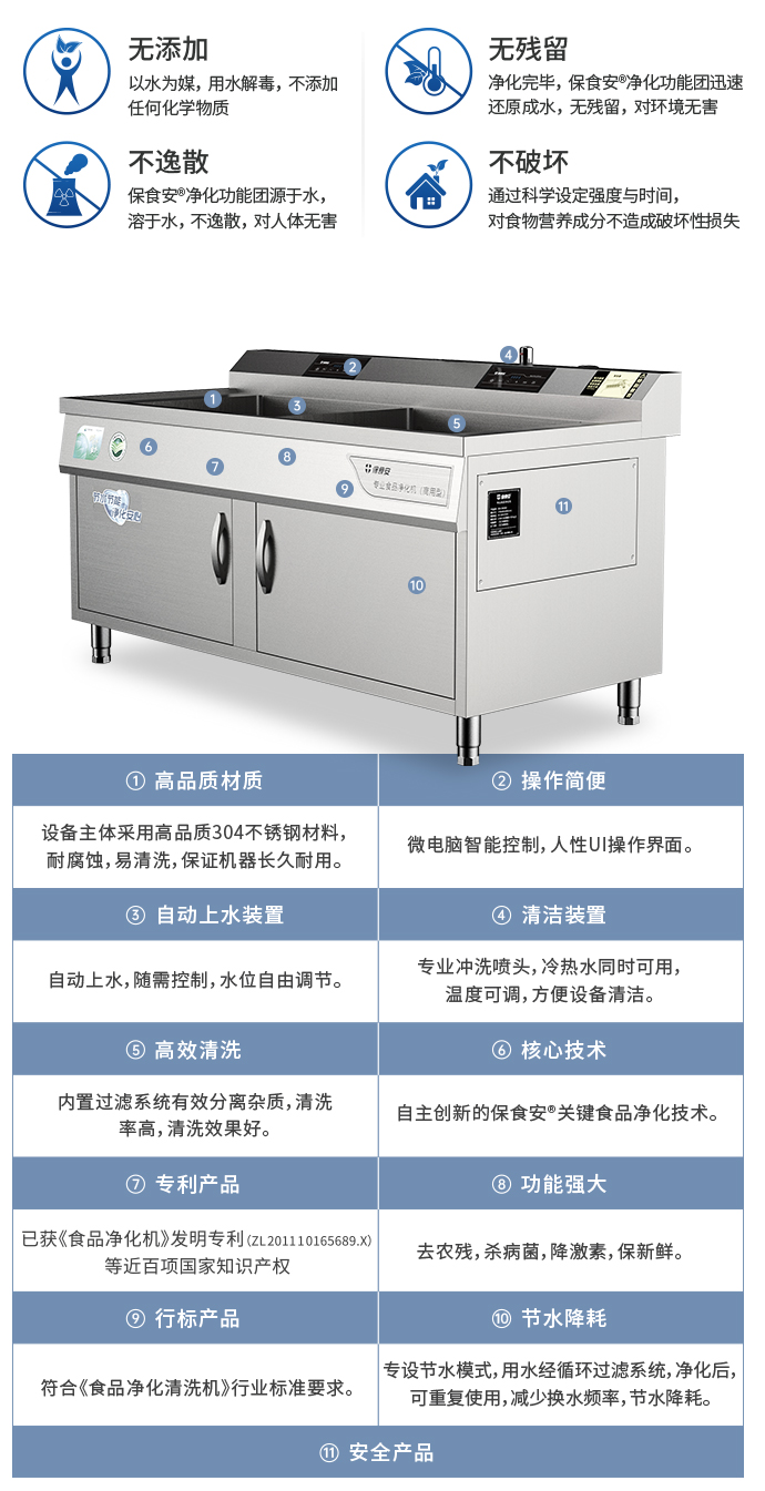 保食安?關(guān)鍵食品凈化技術(shù)再現(xiàn)大自然中的水自我凈化的原理,無任何化學添加,僅用自來水作為原材料,通過創(chuàng)新研發(fā)的保食安?關(guān)鍵食品凈化技術(shù)發(fā)生器,使水分子裂解,生成具有極強氧化能力的保食安?凈化功能團,從而快速殺滅食材上病毒、細菌等致病微生物,高效降解農(nóng)殘、激素、抗生素等化學殘留,不產(chǎn)生二次污染,不破壞食物營養(yǎng),對人與環(huán)境安全無害。