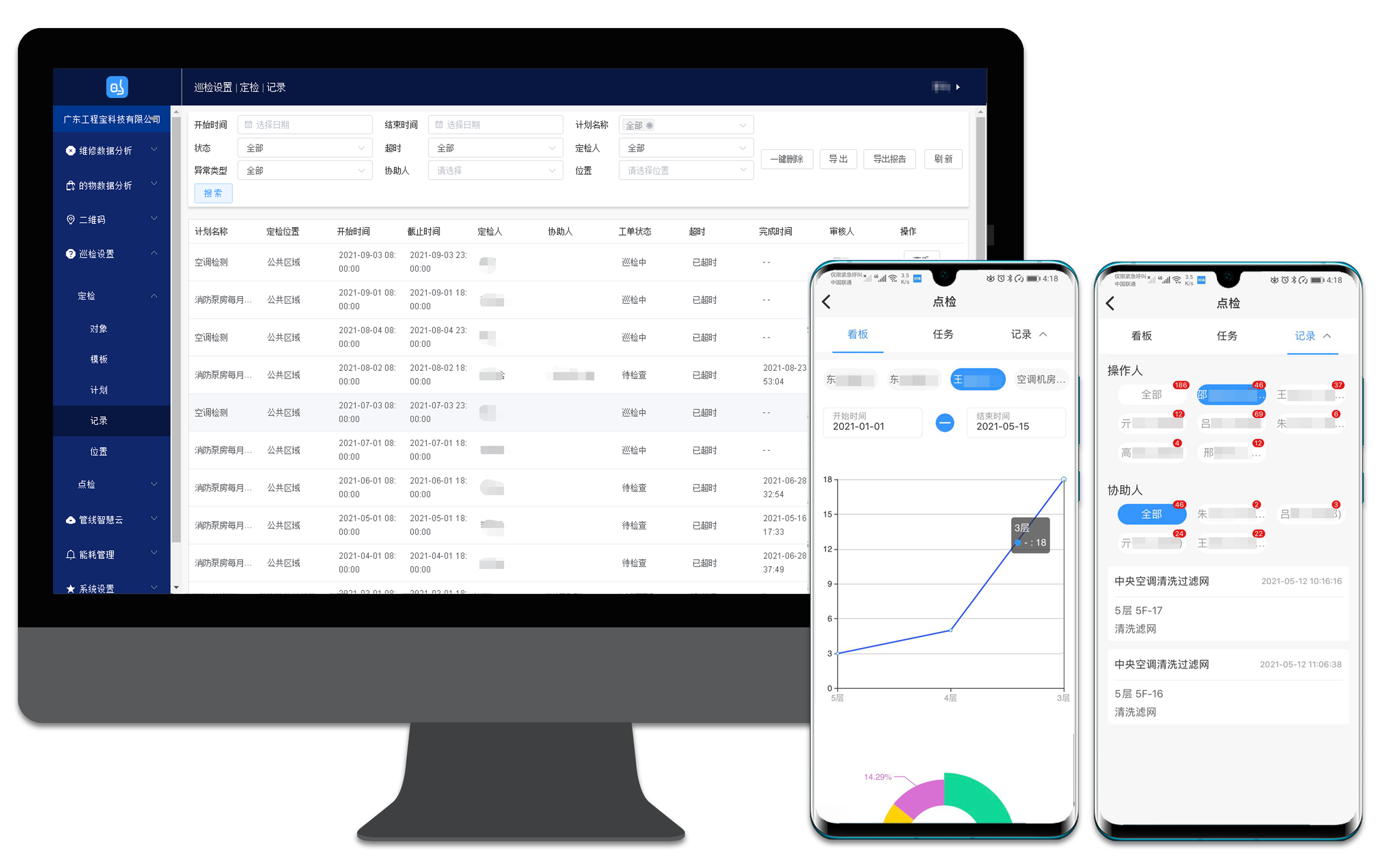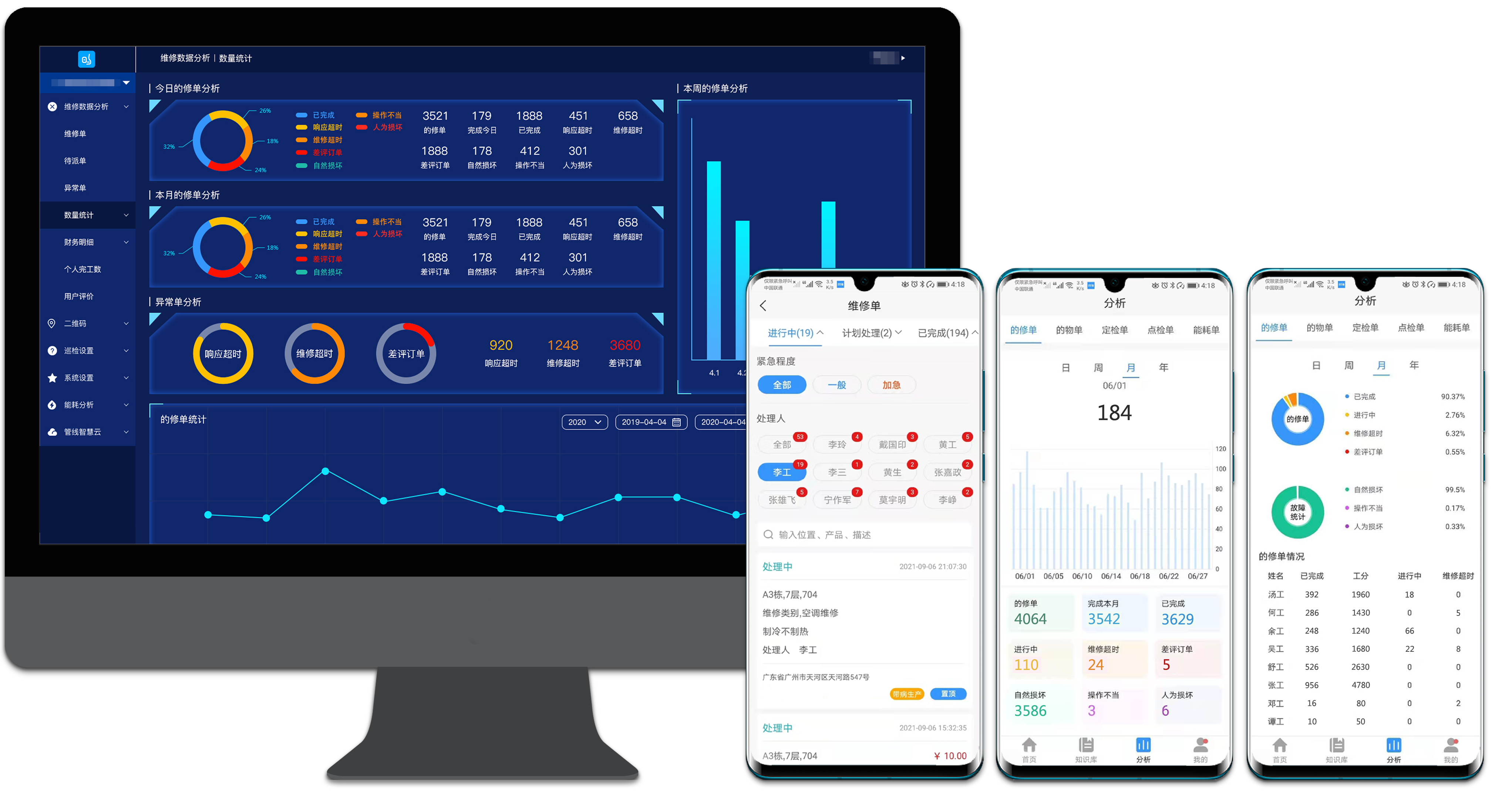 3.移動(dòng)端、PC端后臺(tái)實(shí)時(shí)記錄維修過(guò)程,實(shí)現(xiàn)從報(bào)修、派工、維修、驗(yàn)收、評(píng)價(jià)等全流程跟蹤服務(wù)管理,并通過(guò)大屏呈現(xiàn)的工單量、報(bào)修率、故障原因、維修超時(shí)、返修單、差評(píng)單等數(shù)據(jù)分析結(jié)果,對(duì)員工進(jìn)行量化考核,制定維護(hù)決策,確保設(shè)備的正常運(yùn)行。