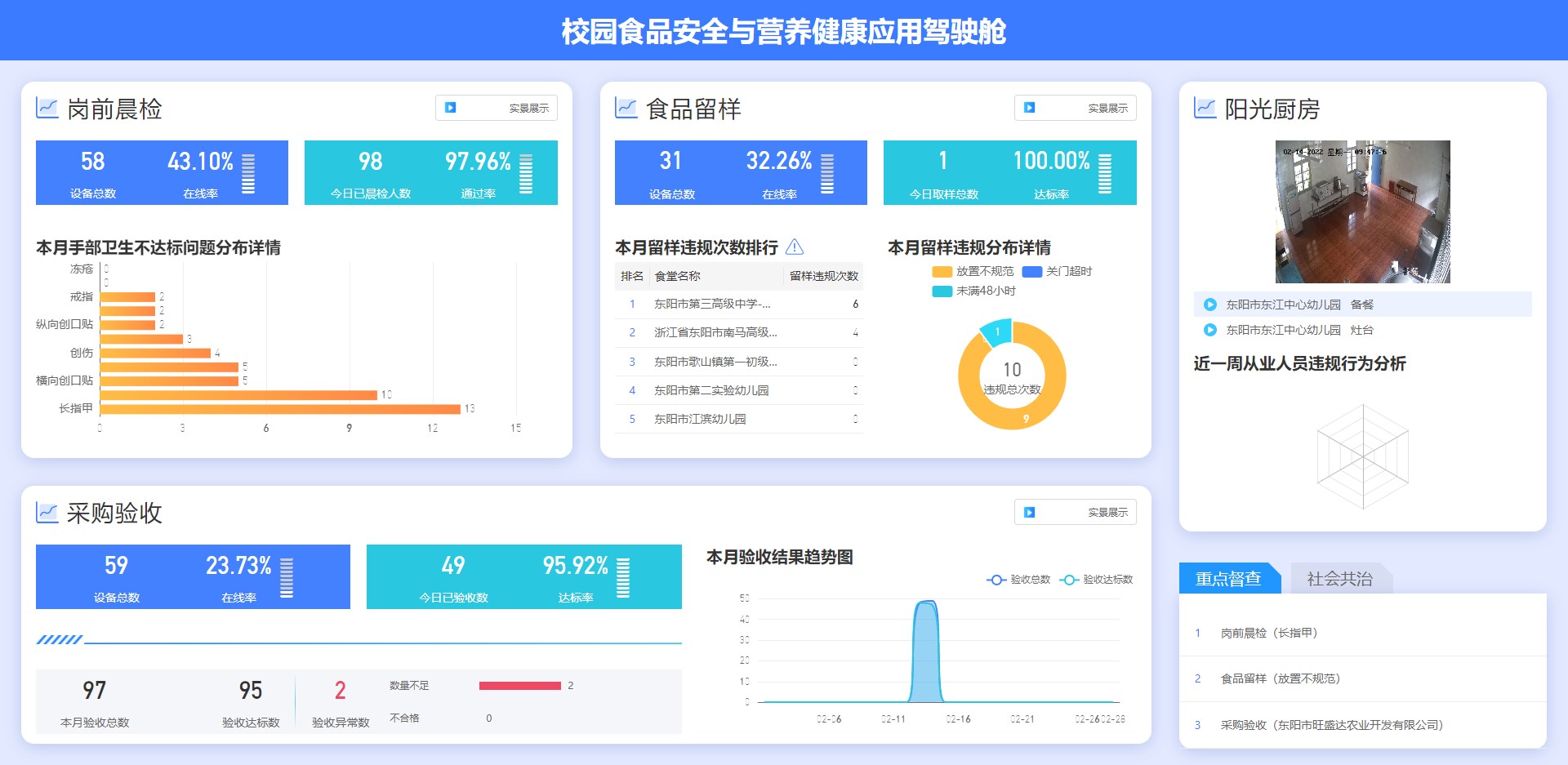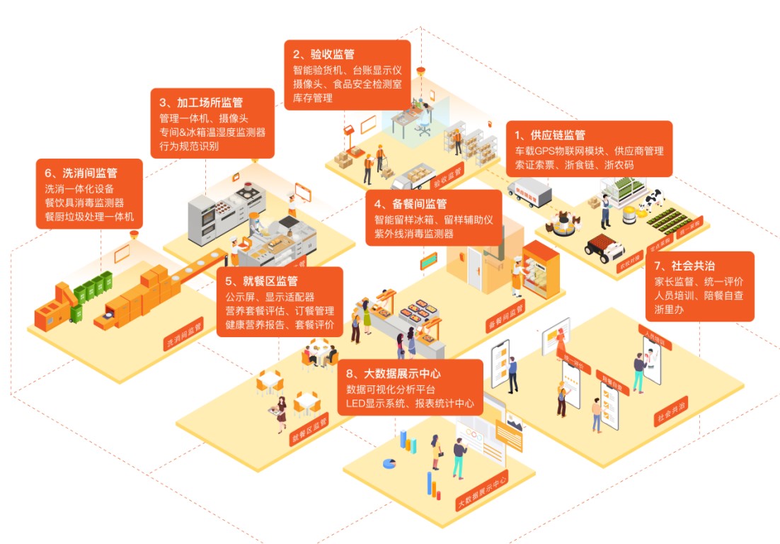 數(shù)字化食品安全的全場景應(yīng)用,從供應(yīng)鏈到食材驗收,通過云端平臺實現(xiàn)線上采購和配送管理,利用智能驗貨機來確保食材品質(zhì)和票證合格;