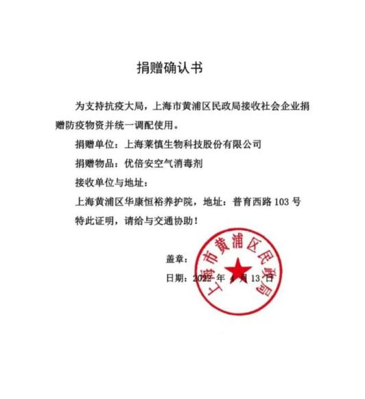 在當(dāng)前疫情形勢嚴(yán)峻的情況下,上海萊慎生物科技股份有限公司克服重重困難,迅速籌措各類防疫物資,保障消殺防疫工作,并先后向全國多個地區(qū)捐贈防疫物資,展現(xiàn)了企業(yè)強(qiáng)大的社會責(zé)任感。