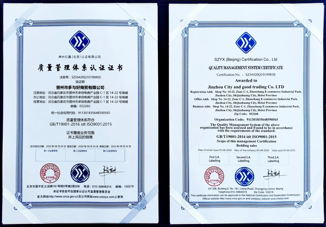 柳伊的每個(gè)產(chǎn)品都有省級(jí)以上質(zhì)檢報(bào)告,公司經(jīng)過阿里巴巴實(shí)地認(rèn)證、3A級(jí)信用企業(yè)認(rèn)證和ISO9001質(zhì)量管理體系認(rèn)證,可以為顧客提供各項(xiàng)手續(xù)、證件和資質(zhì)。