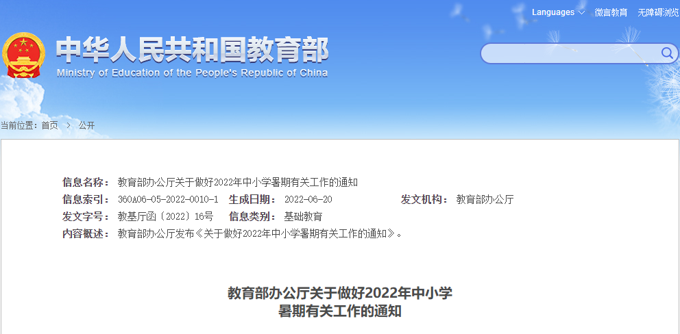 《教育部辦公廳關于做好2022年中小學暑期有關工作的通知》