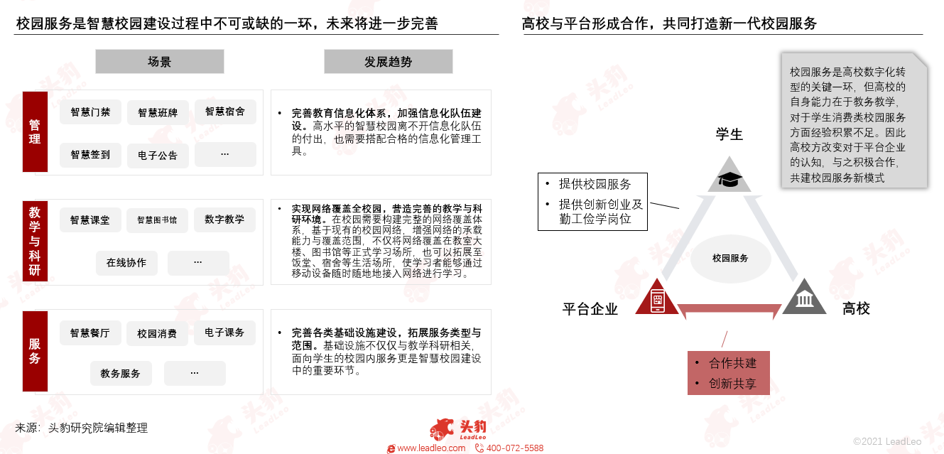 校園服務(wù)場(chǎng)景是智慧校園建設(shè)場(chǎng)景中的重要一環(huán)?,F(xiàn)如今,不僅高校積極與第三方平臺(tái)企業(yè)合作共同打造新一代校園服務(wù)外,各地政府也積極倡導(dǎo)學(xué)校注重引入社會(huì)資源,如北京市即提出“支持學(xué)校通過復(fù)用市、區(qū)級(jí)共性應(yīng)用或購買社會(huì)服務(wù)的方式,降低信息化投入成本,避免重復(fù)建設(shè)。探索多元投入機(jī)制,引導(dǎo)社會(huì)企業(yè)參與教育信息化建設(shè),實(shí)現(xiàn)共贏,激發(fā)市場(chǎng)活力?!?/span>