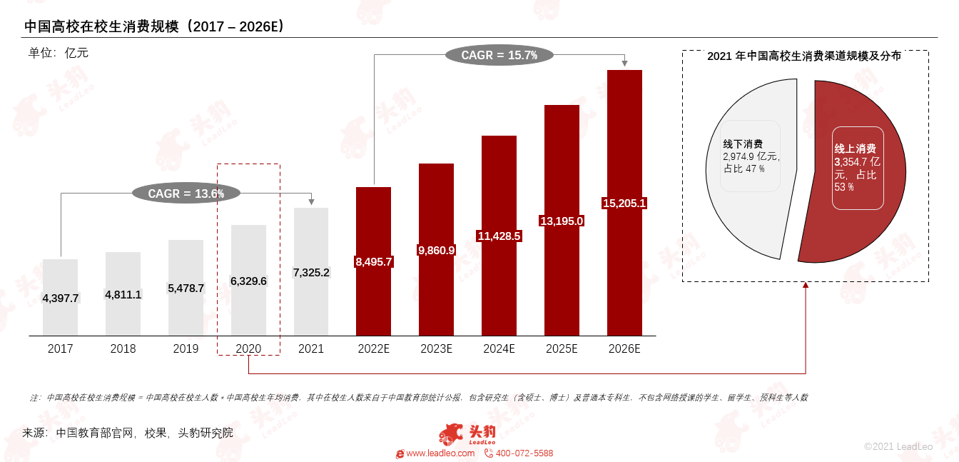 在疫情防控常態(tài)化的背景下,學(xué)生大部分的消費(fèi)被圈定在校園內(nèi),同時(shí)由于學(xué)生對(duì)于線上消費(fèi)的偏好,智慧校園新消費(fèi)互動(dòng)及校園數(shù)字化生活服務(wù)平臺(tái)因此也得到了迅速發(fā)展。頭豹研究院測(cè)算,到2026年中國高校在校生消費(fèi)規(guī)模將達(dá)到 15,205.1億元,也將為平臺(tái)創(chuàng)造廣闊的成長空間。