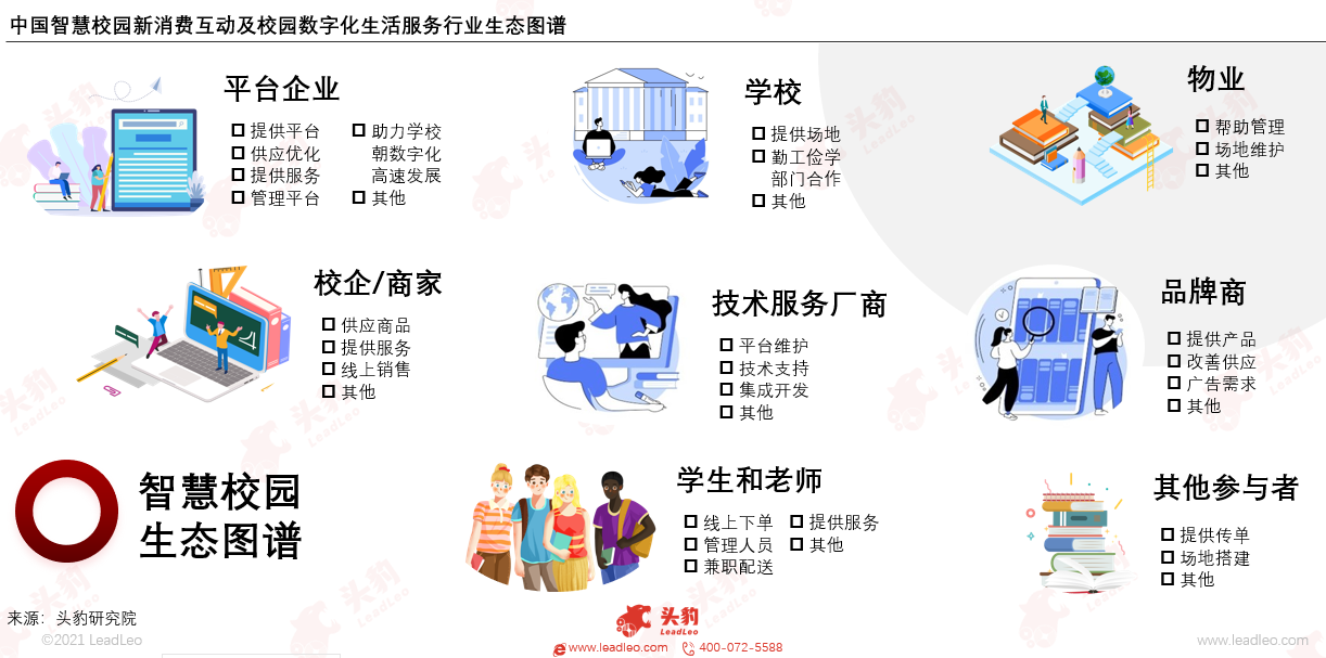 中國智慧校園行業(yè)參與者眾多,包括平臺(tái)企業(yè)、學(xué)校、校企/商家、用戶、品牌商、技術(shù)服務(wù)廠商、物業(yè)以及其他參與者,行業(yè)參與者間相輔相成、合作共贏,形成了龐大的行業(yè)生態(tài)。