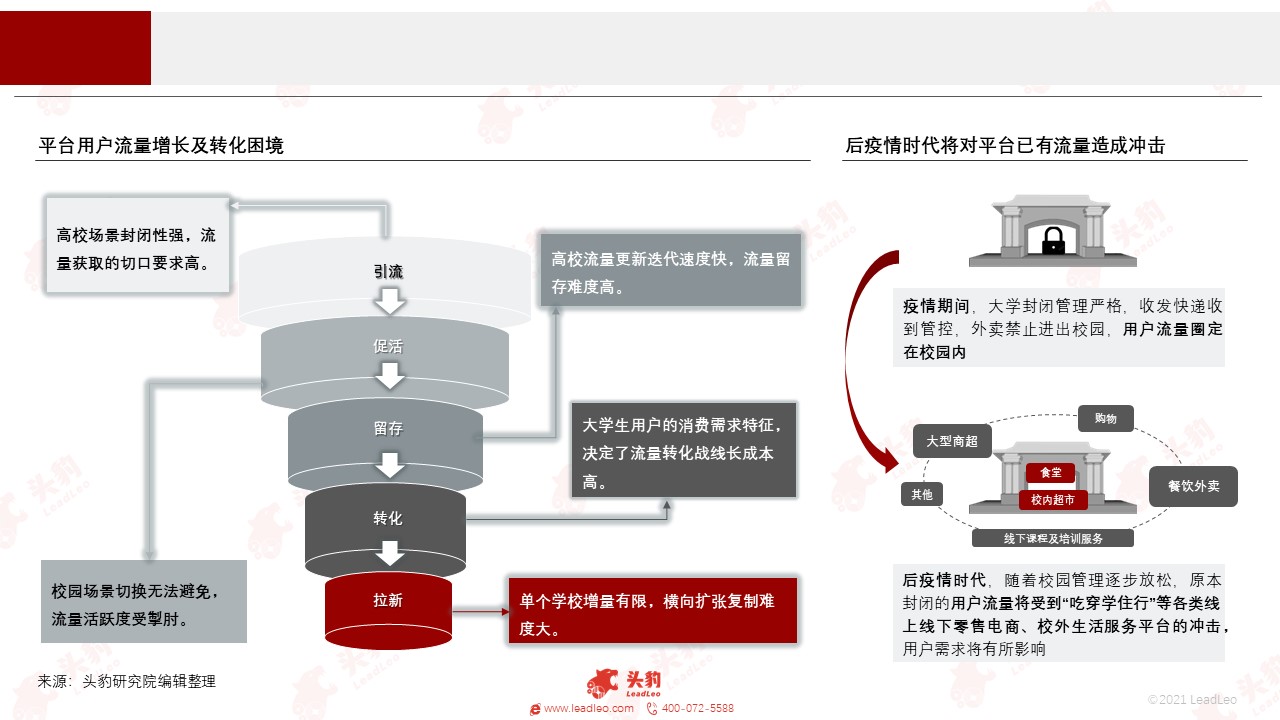 校園場(chǎng)景封閉性強(qiáng),假期場(chǎng)景切換、人員代際流動(dòng)等現(xiàn)實(shí)問題無法避免,平臺(tái)面臨用戶流量增長及轉(zhuǎn)化困境,而后疫情時(shí)代也將對(duì)平臺(tái)已有流量造成沖擊,行業(yè)入局者需思考流量維護(hù)及未來發(fā)展方向。