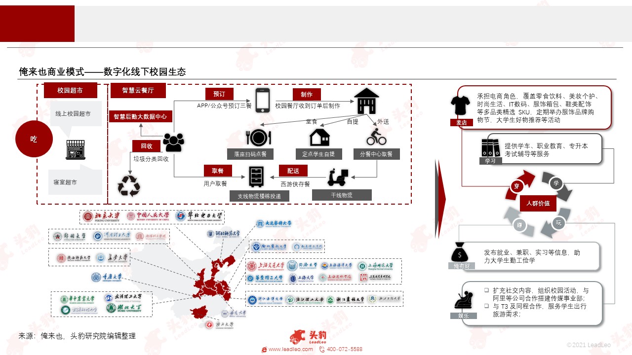 俺來也以高校為基點(diǎn),精準(zhǔn)聚焦受眾群體,把握持續(xù)化高頻剛需,從餐飲切入賽道,依托校園資源并協(xié)同未途科技打造智慧校園下的數(shù)字新零售。俺來也前期積累基礎(chǔ)流量,后期疊加拓展“穿”、“學(xué)”、“住”、“行”等板塊業(yè)務(wù),以本地生活流量帶動(dòng)供應(yīng)鏈經(jīng)銷及品牌廣告?zhèn)髅?,與產(chǎn)業(yè)鏈上各環(huán)節(jié)共建關(guān)系并創(chuàng)造價(jià)值。