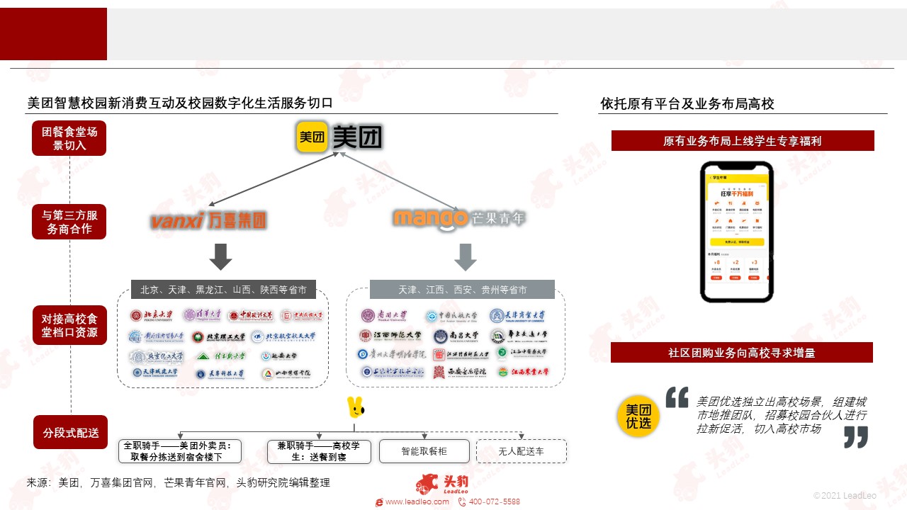 美團(tuán)聚焦“零售+科技”新核心戰(zhàn)略,從大眾消費(fèi)中細(xì)分并獨(dú)立高校市場(chǎng),從高校團(tuán)餐食堂場(chǎng)景切入賽道。美團(tuán)定位校內(nèi)餐飲的補(bǔ)充延伸運(yùn)營商,依托原有平臺(tái)及業(yè)務(wù)布局,覆蓋餐飲外賣、酒店旅游、社區(qū)電商等多場(chǎng)景,在高校消費(fèi)生態(tài)內(nèi)挖掘增量空間。