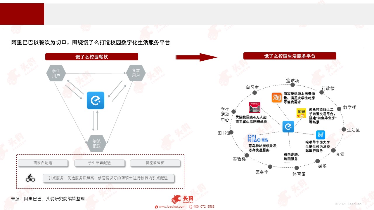 阿里以餓了么建立服務(wù)以及流量入口,在原有用戶存量中進(jìn)一步細(xì)分人群需求,進(jìn)場(chǎng)大學(xué)校園。依托原有電商零售等平臺(tái)的龐大用戶存量,阿里布局多業(yè)務(wù)矩陣協(xié)同合力,基于高校新餐飲、新零售和新生活的場(chǎng)景,塑造升級(jí)校園服務(wù)。