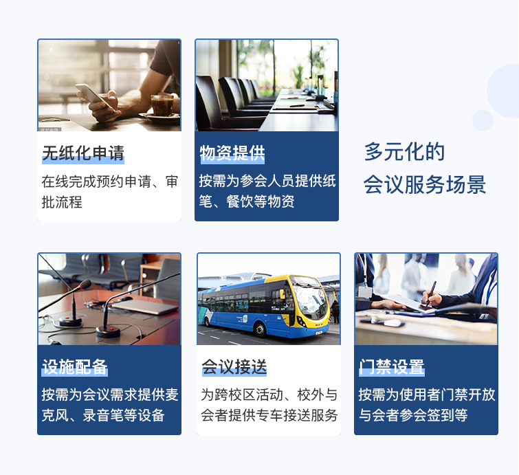 籌備會議無需再東奔西跑、焦頭爛額,一站式完成預約申請、會前準備、物資訂購、與會通知等跨角色、跨部門、跨業(yè)務工作,高效協(xié)同,打造貼心會議服務。