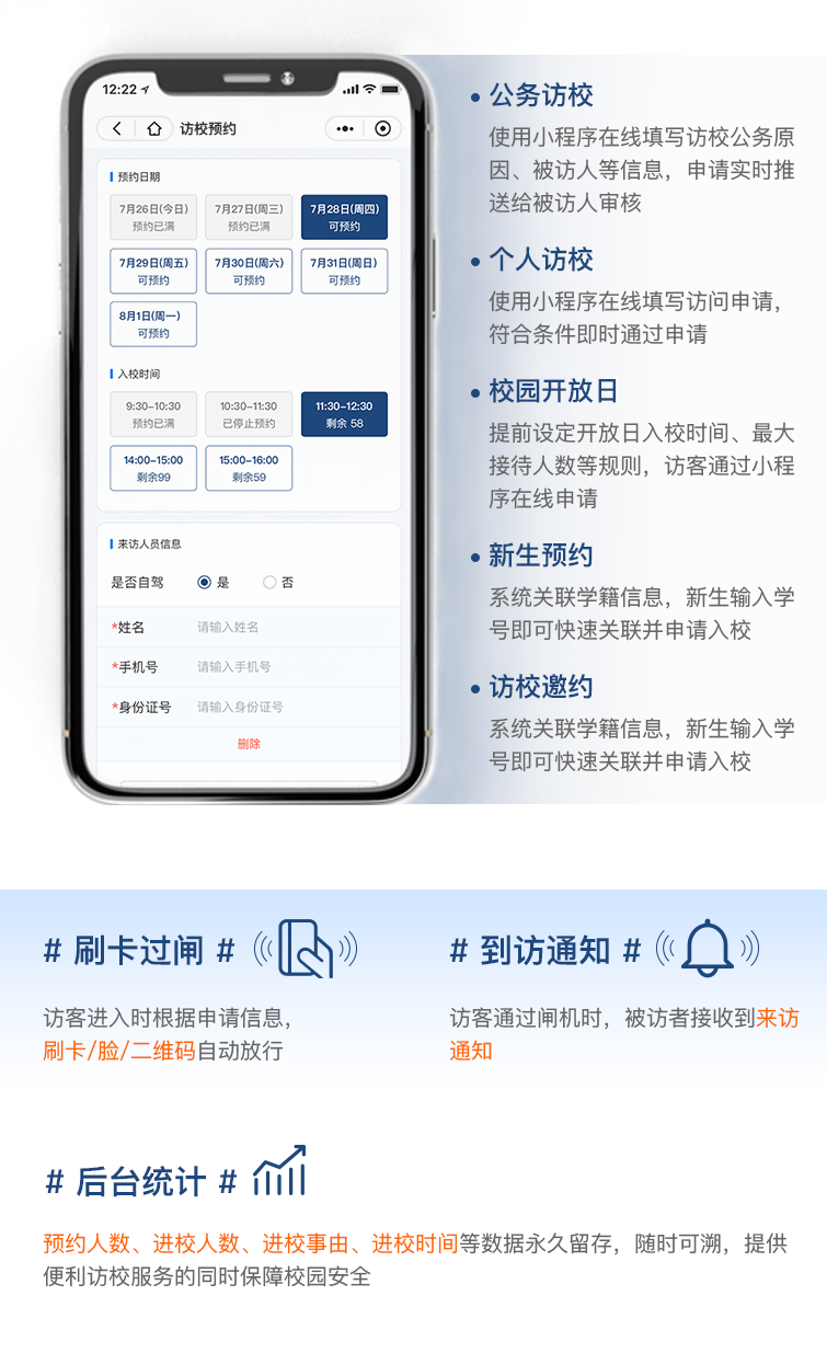 申請入校無需經歷冗長流程,針對不同入校情形提供差異化預約方案,不管是個人來訪、校園開放日、新生到校還是來訪邀約,均可快速在線完成入校預約流程,輕松應對不同場景下的入校管控!