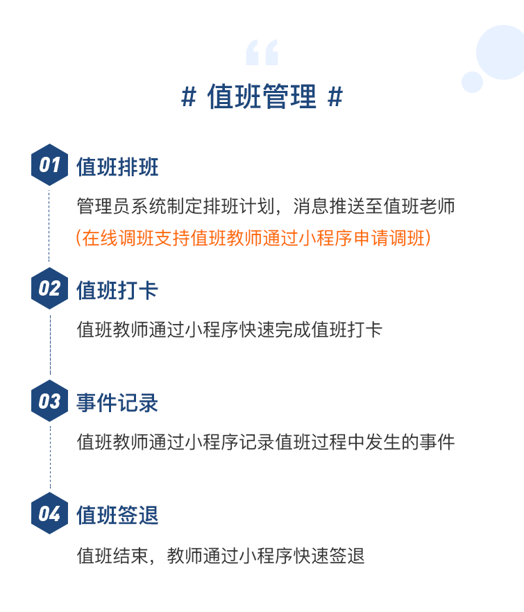線上便捷完成排班、調班、值班、打卡等辦公事項,提高管理效率,帶來智能辦公便捷新體驗。