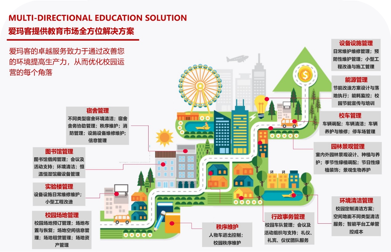 愛瑪客成立于1936年,作為全球領(lǐng)先的多元化服務(wù)企業(yè),愛瑪客提供全方位綜合設(shè)施管理服務(wù)和餐飲服務(wù)。在教育領(lǐng)域,愛瑪客根植于校園服務(wù),為全球超過2500所教育機(jī)構(gòu)和逾500萬學(xué)生提供基于價值和成果的解決方案及最佳實踐,諸如國際知名的約翰霍普金斯大學(xué)、西北大學(xué)、賓夕法尼亞大學(xué)、喬治華盛頓大學(xué)等。