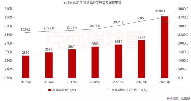 根據(jù)教育部公布的統(tǒng)計數(shù)據(jù),2021年,我國各級各類學(xué)校數(shù)量為52.93萬所,在校生2.91億人。其中高等學(xué)校數(shù)量達(dá)到3012所,較2015年增加452所,復(fù)合增長率2.8%;在校生數(shù)由2015年的2625.3萬人增長至2021年的3496.1萬人,復(fù)合增長率為4.9%。各種形式的高等教育在學(xué)總規(guī)模4430萬人。由此可見,我國普通高校及在校生數(shù)量均呈現(xiàn)持續(xù)增長態(tài)勢,為高校物業(yè)管理服務(wù)帶來巨大市場空間。