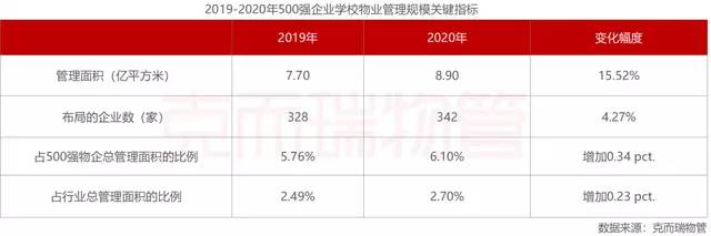 學(xué)校物管潛在的市場規(guī)模讓眾多物業(yè)企業(yè)盯上這塊蛋糕??硕鹞锕軘?shù)據(jù)顯示,2020年,500強(qiáng)企業(yè)中有342家企業(yè)涉足學(xué)校物業(yè)服務(wù),占比68.4%,較2019年略有提升。同時,500強(qiáng)企業(yè)學(xué)校物業(yè)總管理面積達(dá)8.9億平方米,同比增加15.52%。