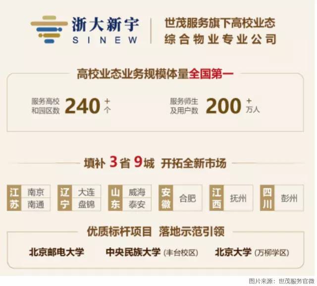 世茂服務(wù)在2020年8月收購了浙大新宇51%股份,首次涉足高校業(yè)態(tài)。2021年5月,世茂服務(wù)旗下浙大新宇“智育美好宇同行”全新品牌形象正式亮相,新定位是“中國高校園區(qū)服務(wù)商”,并發(fā)布了行業(yè)首個針對“校園后勤服務(wù)”研發(fā)的“宇林校園服務(wù)生態(tài)”,此次品牌煥新是高校后勤與物業(yè)管理的首次跨界融合。