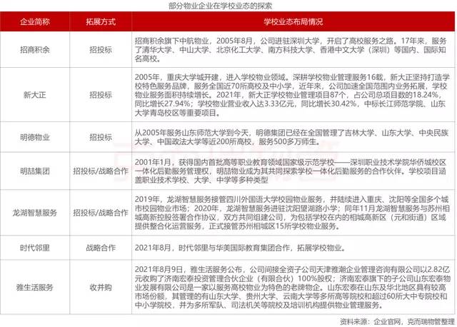 此外,物業(yè)企業(yè)除了布局高校物管服務(wù)之外,還涉足中小學(xué)后勤服務(wù)。