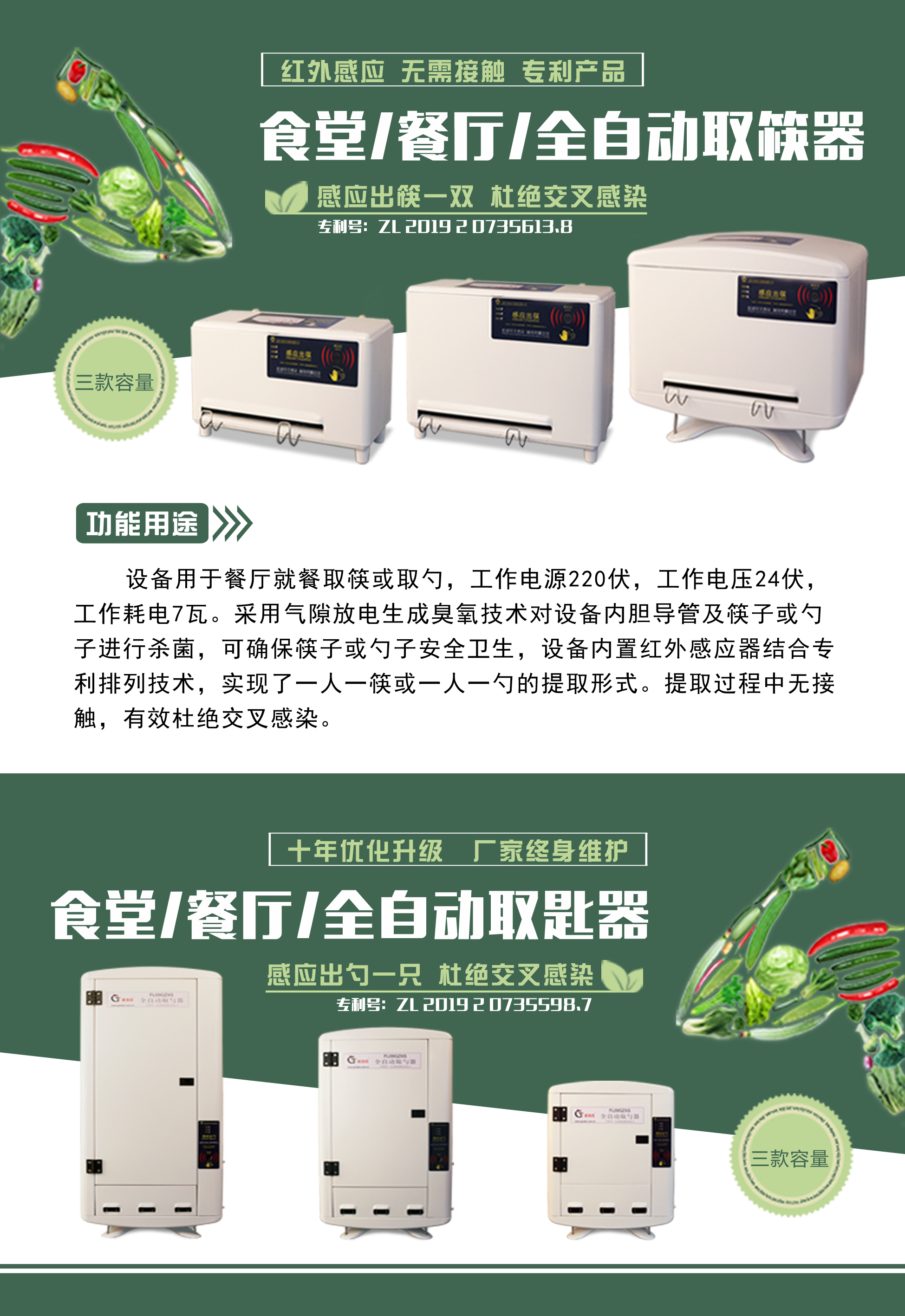 飛龍電子此次在展會將要展示的產(chǎn)品主要用于餐廳就餐取筷或取勺。產(chǎn)品工作電源220伏,工作電壓24伏,工作耗電7瓦。采用氣隙放電生成臭氧技術(shù)對產(chǎn)品內(nèi)部及筷子或勺子進(jìn)行殺菌,可確??曜踊蛏鬃影踩l(wèi)生,產(chǎn)品內(nèi)置紅外感應(yīng)器結(jié)合專利排列技術(shù),實(shí)現(xiàn)一人一筷或一人一勺的提取形式,可有效杜絕交叉感染發(fā)生。