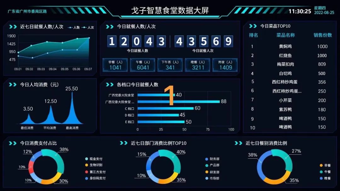 1、智能監(jiān)控大屏,實時掌握食堂運營態(tài)勢,及時做出運營調(diào)整。
