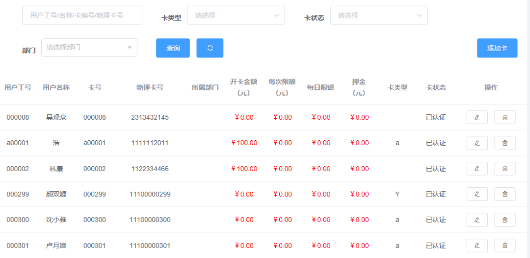 1、可通過用戶工號、卡號、名稱、部門等查詢方式對用戶一卡通賬戶進行現(xiàn)金的充值操作,以及進行餐補金額補貼操作。