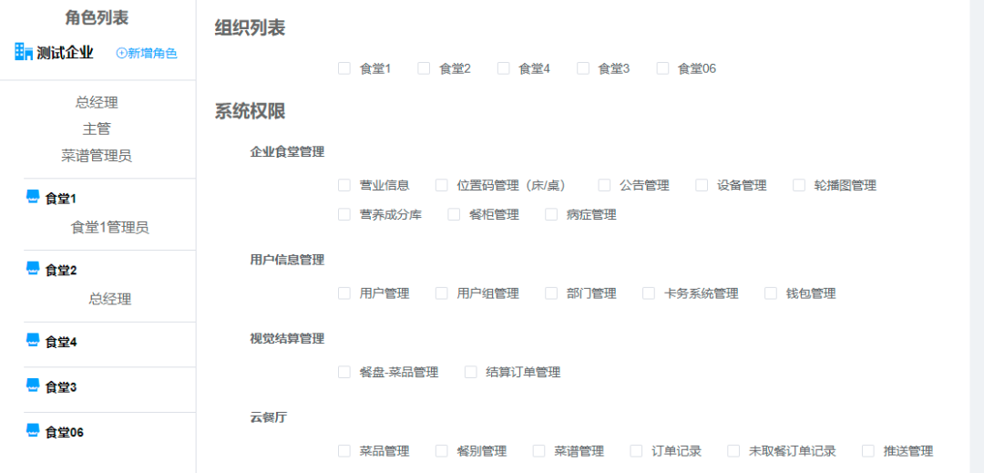 支持人員組織機構及權限角色的配置,滿足食堂人員權限的需求。企業(yè)可根據(jù)食堂或企業(yè)內(nèi)部管理人員身份,創(chuàng)建員工賬號并分配角色。