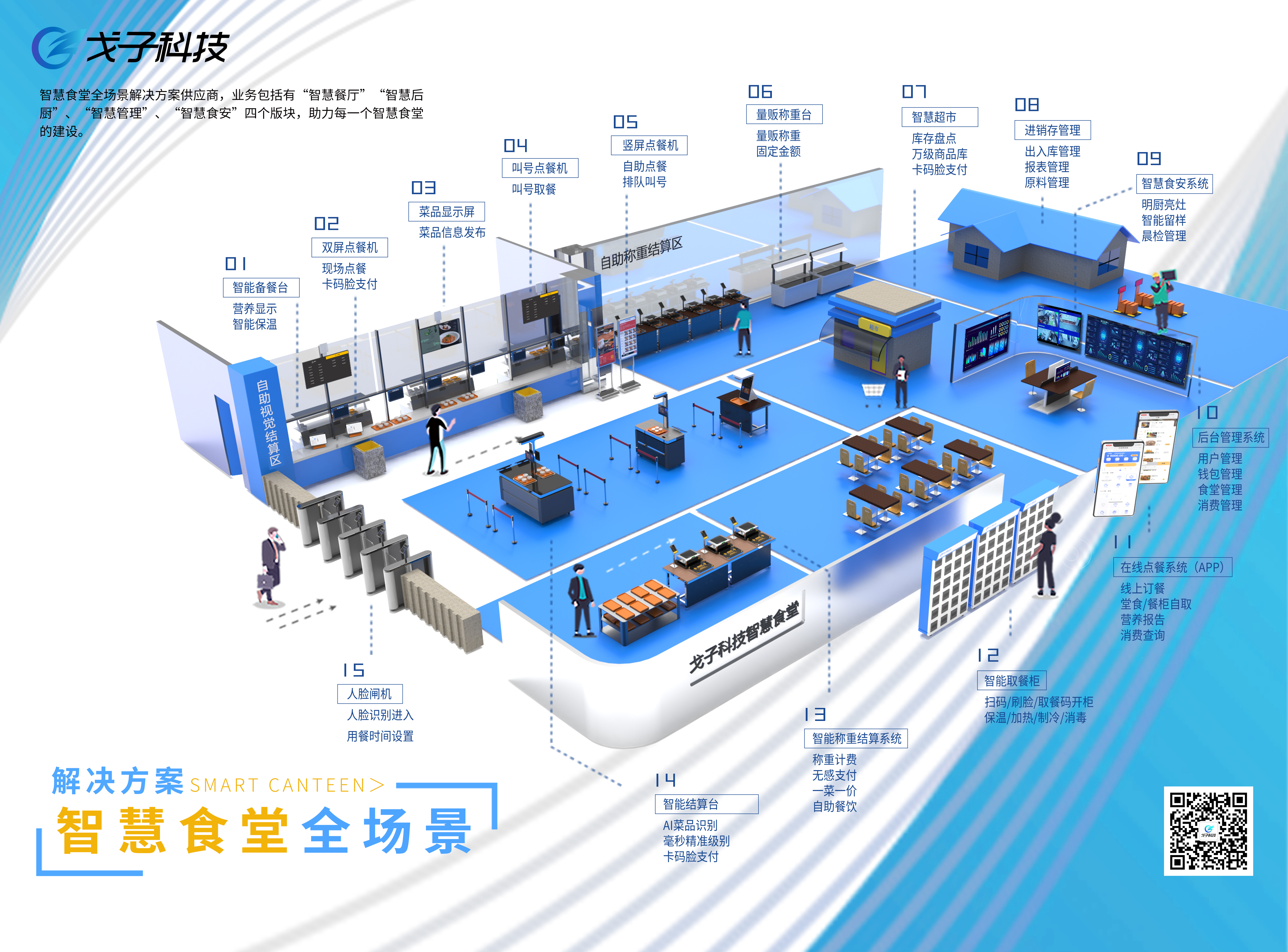 針對以往食堂套餐、自助餐、檔口打餐存在的打菜時間長、菜品浪費多、管理成本高的弊端,智慧食堂推出了配置行業(yè)領先RFID和AI技術的小碗菜、計量自助餐、檔口自助點餐三種餐線,輔以自動收銀、餐柜取餐、叫號取餐等結算取餐方式,提高了消費者的就餐效率與食堂經(jīng)營者的管理效率。