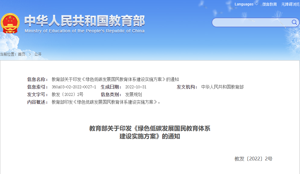 ▲教育部《綠色低碳發(fā)展國民教育體系建設(shè)實(shí)施方案》