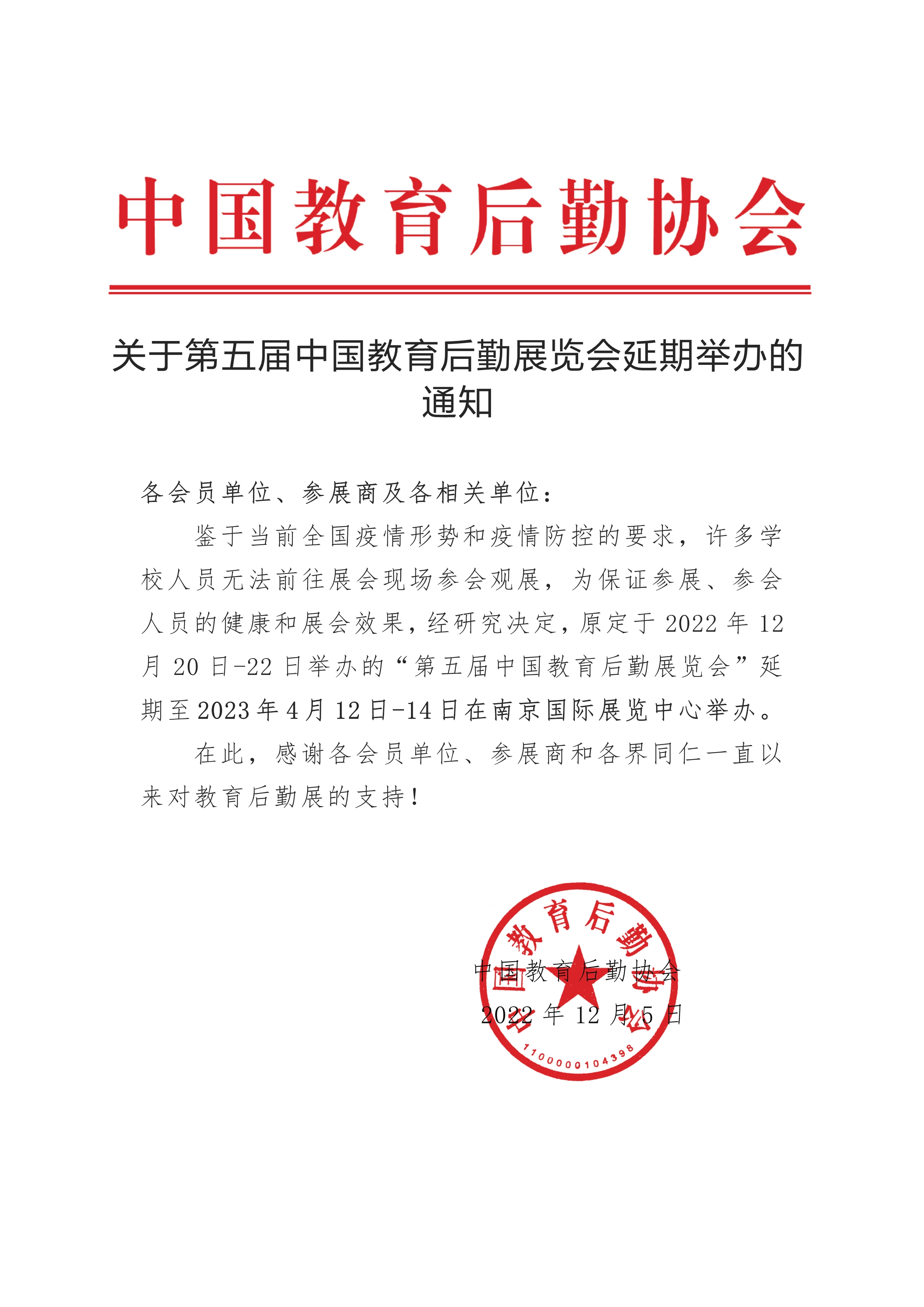 鑒于當(dāng)前全國疫情形勢和疫情防控的要求,許多學(xué)校人員無法前往展會現(xiàn)場參會觀展,為保證參展、參會人員的健康和展會效果,經(jīng)研究決定,原定于2022年12月20日-22日舉辦的“第五屆中國教育后勤展覽會”延期至2023年4月12日-14日在南京國際展覽中心舉辦。