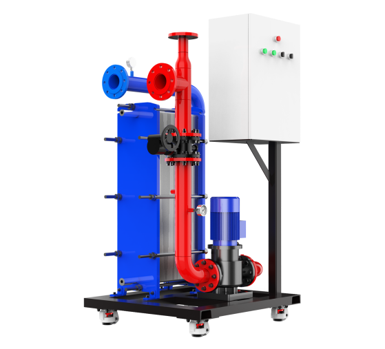 由循環(huán)泵、板式換熱器、配電箱、管道、閥門、儀 表、底座(配有承重減振萬向輪)等構成。