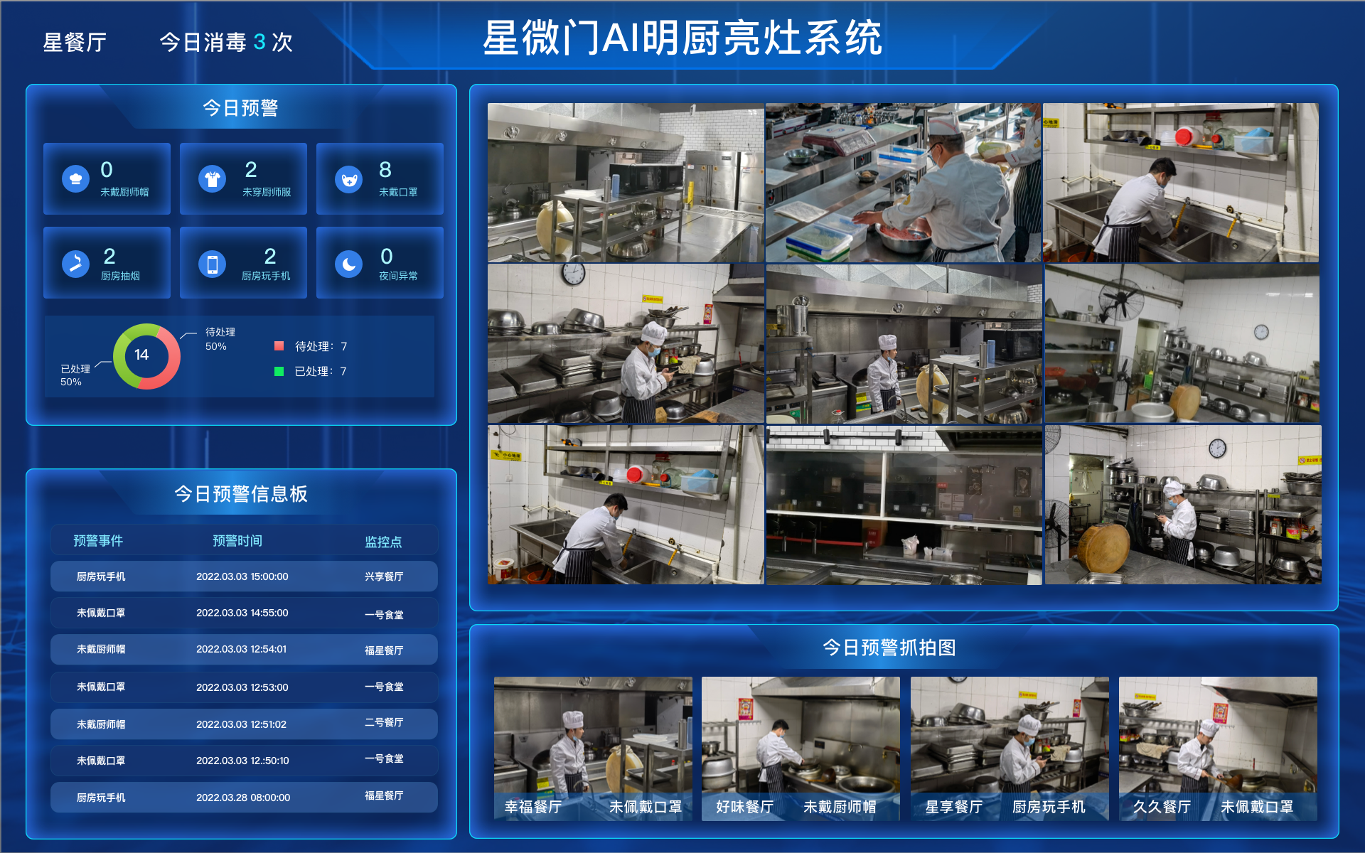 星微門AI明廚亮灶系統(tǒng),通過云端部署和AI賦能,實(shí)現(xiàn)人員行為監(jiān)測、鼠患監(jiān)測、吸煙監(jiān)測、動(dòng)火離人監(jiān)測、玩手機(jī)監(jiān)測等各方面智能實(shí)時(shí)管控,加強(qiáng)人員及食品安全生產(chǎn)監(jiān)管力度,相關(guān)監(jiān)控?cái)?shù)據(jù)還可同步到監(jiān)管部門,實(shí)現(xiàn)多級(jí)監(jiān)控,接受公眾監(jiān)督,多維度保障,讓用餐更安全,更放心。