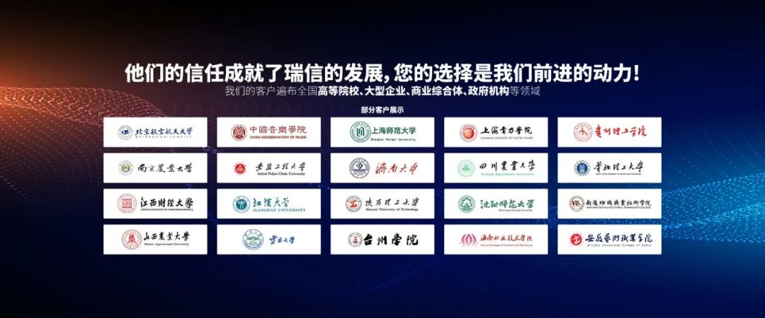 其中典型客戶有中國音樂學(xué)院、北京航空航天大學(xué)、上海政法大學(xué)、上海理工大學(xué)、南京農(nóng)業(yè)大學(xué)、蘇州信息學(xué)院、安徽工程大學(xué)、淮南師范學(xué)院、河南新鄉(xiāng)學(xué)院、湖北工業(yè)大學(xué)、江西農(nóng)業(yè)大學(xué)、四川農(nóng)業(yè)大學(xué)、山西農(nóng)業(yè)大學(xué)、華北理工大學(xué)、廣西師范大學(xué)、貴州理工學(xué)院等重量級高校。