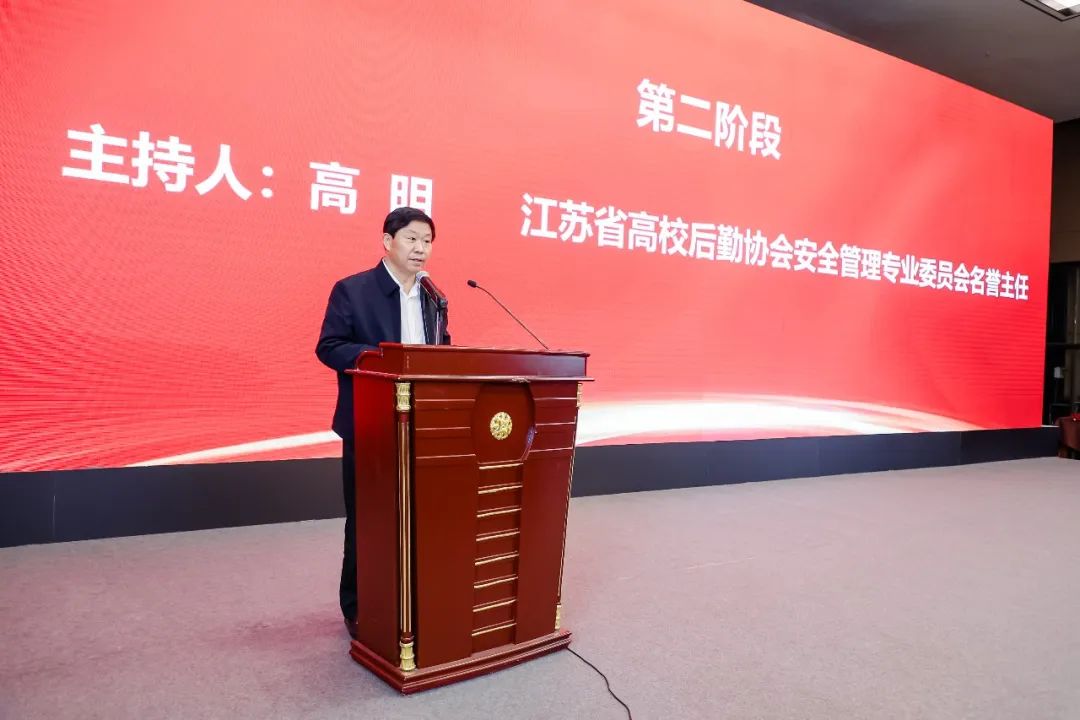 江蘇省高校后勤協(xié)會安全管理專業(yè)委員會名譽主任高明在致辭中首先對本次大會的召開表示祝賀。