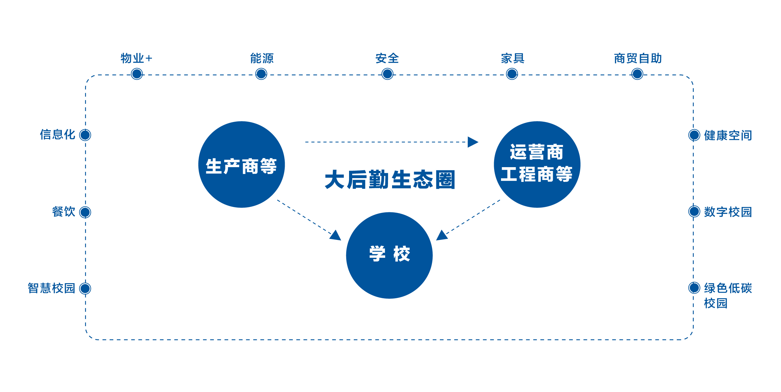 構(gòu)建“場景+供應(yīng)鏈”生態(tài)圈,聚合餐飲、能源、信息化等行業(yè)生產(chǎn)、運(yùn)營、服務(wù)企業(yè)以及院校后勤、保衛(wèi)、基建等管理服務(wù)部門,打造大后勤生態(tài)圈。