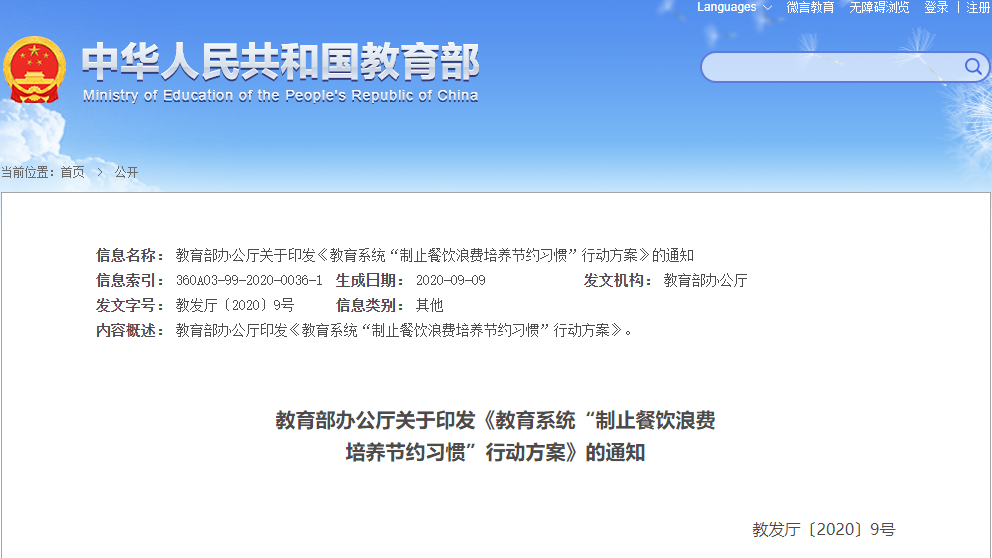 2020年教育部辦公廳印發(fā)《教育系統(tǒng)“制止餐飲浪費(fèi)培養(yǎng)節(jié)約習(xí)慣”行動方案的通知》。