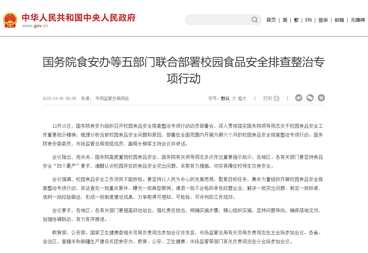 近日,國務(wù)院食安辦組織召開校園食品安全排查整治專項行動動員部署會,梳理分析當(dāng)前校園食品安全問題和原因,部署在全國范圍內(nèi)開展為期六個月的校園食品安全排查整治專項行動。
