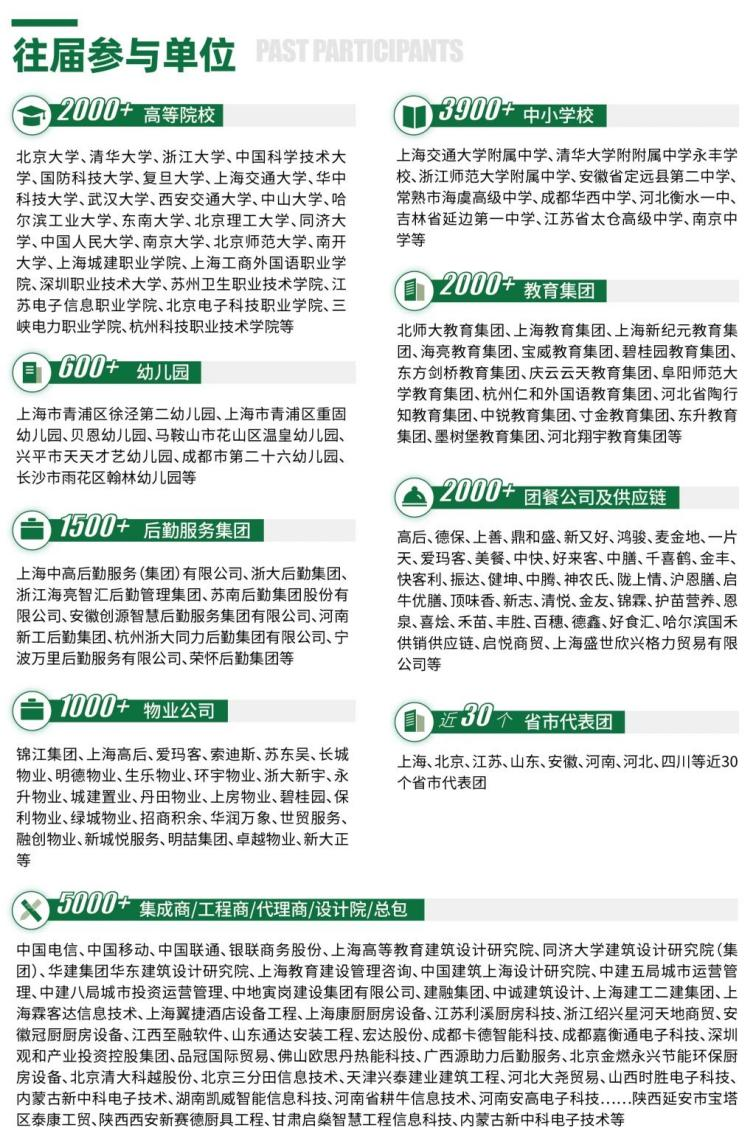 北京大學(xué)、清華大學(xué)、浙江大學(xué)、南京航空航天大學(xué)、深圳大學(xué)、東北財經(jīng)大學(xué)、上海交通大學(xué)附屬中學(xué)、成都華西中學(xué)、上海市青浦區(qū)徐涇第二幼兒園等百余個學(xué)校組團參加上屆CCLE教育后勤展·上海,并給予高度評價。