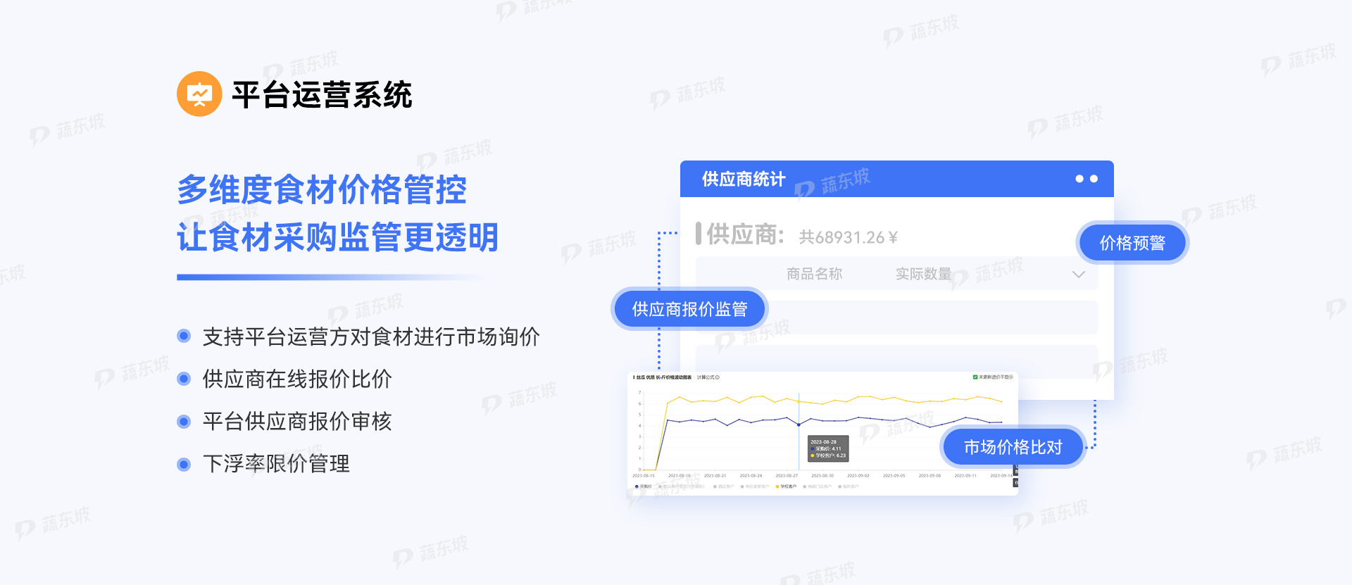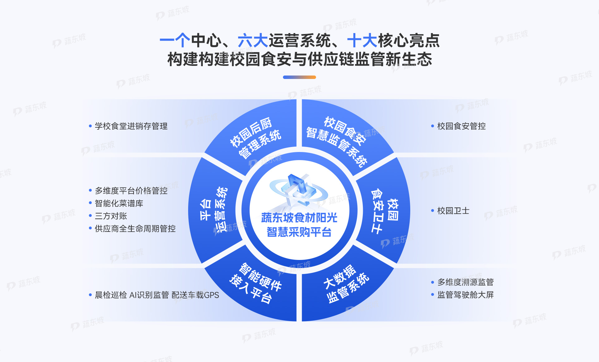 蔬東坡食材陽光智慧采購平臺通過六大系統(tǒng)協(xié)同運作和十大核心亮點全面覆蓋,構(gòu)建校園食安與供應(yīng)鏈監(jiān)管新生態(tài)。
