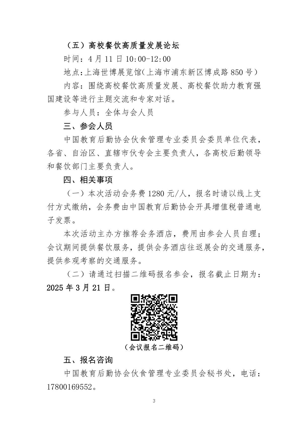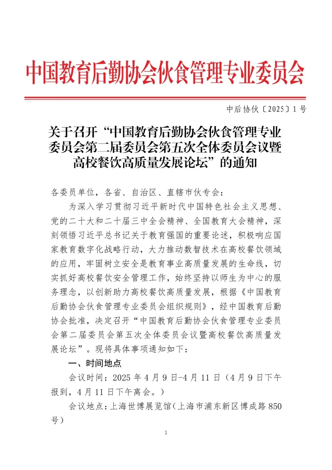 為深入學(xué)習(xí)貫徹習(xí)近平新時代中國特色社會主義思想、黨的二十大和二十屆三中全會精神、全國教育大會精神,深刻領(lǐng)悟習(xí)近平總書記關(guān)于教育強(qiáng)國的重要論述,積極響應(yīng)國家教育數(shù)字化戰(zhàn)略行動,大力推動數(shù)智技術(shù)在高校餐飲領(lǐng)域的應(yīng)用,牢固樹立安全是教育事業(yè)高質(zhì)量發(fā)展的生命線,切實(shí)抓好高校餐飲安全管理工作,始終堅(jiān)持以師生為中心的服務(wù)理念,以創(chuàng)新助力高校餐飲高質(zhì)量發(fā)展,根據(jù)《中國教育后勤協(xié)會伙食管理專業(yè)委員會組織規(guī)則》,經(jīng)中國教育后勤協(xié)會批準(zhǔn),決定召開“中國教育后勤協(xié)會伙食管理專業(yè)委員會第二屆委員會第五次全體委員會議暨高校餐飲高質(zhì)量發(fā)展論壇”。現(xiàn)將具體事項(xiàng)通知如下: