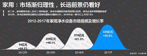 中怡康研究數(shù)據(jù)顯示,2012年整個(gè)家用凈水的規(guī)模只有54億,到今年年底預(yù)計(jì)會(huì)達(dá)到336億,市場(chǎng)容量增加了5倍,這是第一個(gè)需要關(guān)注的點(diǎn)。從數(shù)據(jù)可以看到,從2016年開(kāi)始,整個(gè)市場(chǎng)增長(zhǎng)速度放緩,最近兩年維持在20%左右的增長(zhǎng)速度。在2015年之前,市場(chǎng)增長(zhǎng)速度在50%左右,甚至更高,這是要關(guān)注的第二點(diǎn)。2012年,凈水產(chǎn)業(yè)只占全體家電銷(xiāo)售額的0.5%,也就是說(shuō)貢獻(xiàn)了0.5%的銷(xiāo)售規(guī)模,2016年這個(gè)數(shù)字已經(jīng)上升到1.8%。中怡康預(yù)計(jì),2017年,這個(gè)數(shù)字會(huì)上升到2%以上。