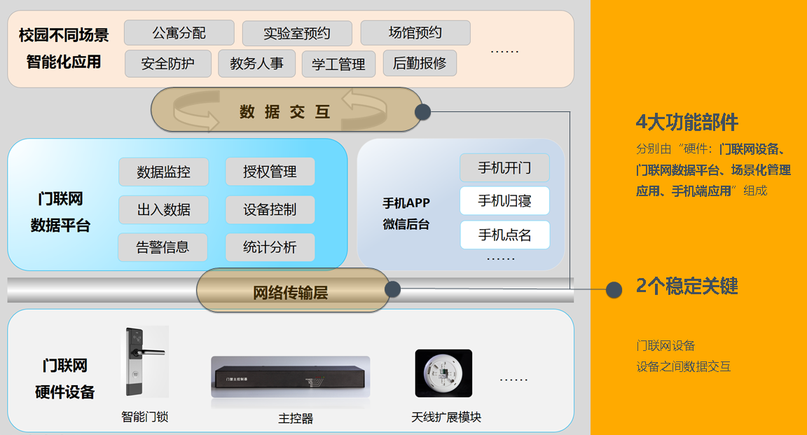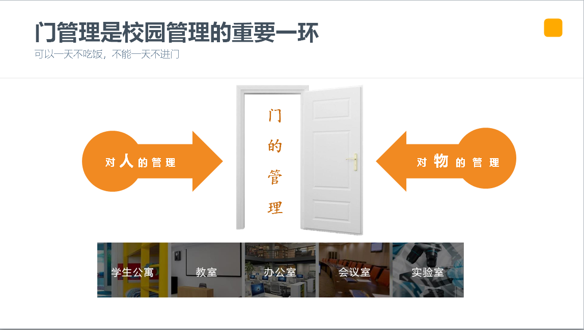 “可以一天不吃飯,不能一天不進(jìn)門(mén)”,門(mén)就是對(duì)人和物的管理,學(xué)校的辦公室、實(shí)驗(yàn)室、會(huì)議室、教室、宿舍等都涉及到人員的進(jìn)出,而在每天必用的這些場(chǎng)合仍然沿用傳統(tǒng)的鑰匙進(jìn)行管理,成為了校園信息化建設(shè)的“最后一公里”掌門(mén)物聯(lián)門(mén)聯(lián)網(wǎng)方案就是為了解決這個(gè)人和物的管理保障。