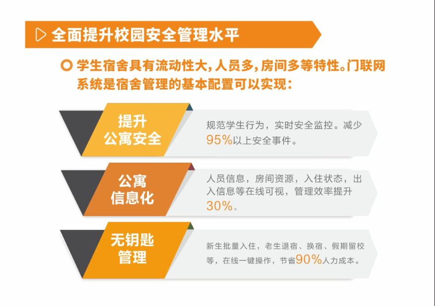 通過(guò)建設(shè)門(mén)聯(lián)網(wǎng)系統(tǒng),極大的提高了學(xué)校的信息化發(fā)展,符合學(xué)校信息化校園和智慧校園的建設(shè)趨勢(shì),通過(guò)提升管理權(quán)限能力、狀況掌控能力、校園安全水平等擺脫傳統(tǒng)的管理理念;