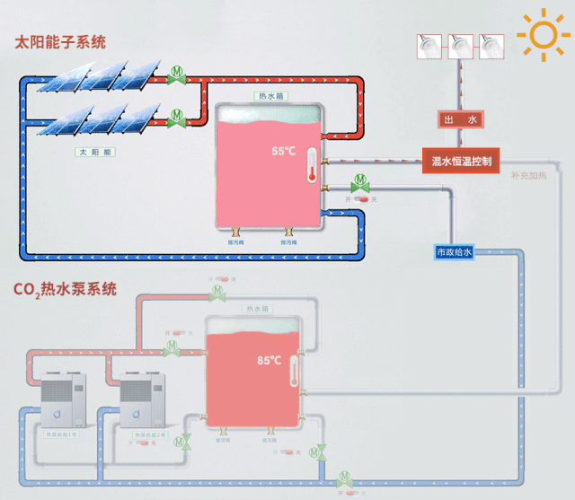 CO2熱泵系統(tǒng)水箱設溫度為85度,太陽能系統(tǒng)水箱溫度設定為55度,當天起好的時候全部用太陽能系統(tǒng),當天起不好的時候,啟用CO2熱泵系統(tǒng)補充熱水。恒溫控制設定根據(jù)用戶出水需要設定。