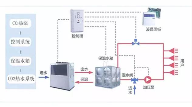 1、CO2熱泵是一次式制熱設備,給水始終由冷水穩(wěn)壓水箱直接供給,熱泵平均運行效率較高;