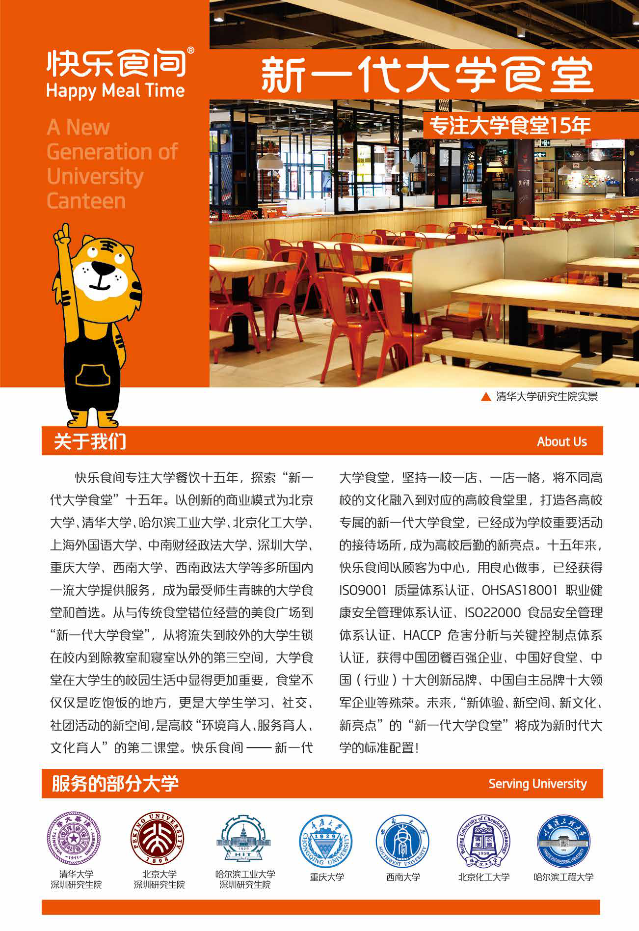 快樂(lè)食間專注大學(xué)餐飲十五年,探索“新一代大學(xué)食堂”十五年。以創(chuàng)新的商業(yè)模式為北京大學(xué)、清華大學(xué)、哈爾濱工業(yè)大學(xué)、北京化工大學(xué)、上海外國(guó)語(yǔ)大學(xué)、中南財(cái)經(jīng)政法大學(xué)、深圳大學(xué)、重慶大學(xué)、西南大學(xué)、西南政法大學(xué)等30 余所國(guó)內(nèi)一流大學(xué)提供服務(wù),每天服務(wù)30 萬(wàn)人次,成為最受師生青睞的大學(xué)食堂和首選。從與傳統(tǒng)食堂錯(cuò)位經(jīng)營(yíng)的美食廣場(chǎng)到“新一代大學(xué)食堂”,從將流失到校外的大學(xué)生鎖在校內(nèi)到除教室和寢室以外的第三空間,大學(xué)食堂在大學(xué)生的校園生活中顯得更加重要,食堂不僅僅是吃飽飯的地方,更是大學(xué)生學(xué)習(xí)、社交、社團(tuán)活動(dòng)的新空間,是高校“環(huán)境育人、服務(wù)育人、文化育人”的第二課堂??鞓?lè)食間- 新一代大學(xué)食堂,堅(jiān)持一校一店、一店一格,將不同高校的文化融入到對(duì)應(yīng)的高校食堂里,打造各高校專屬的新一代大學(xué)食堂,已經(jīng)成為學(xué)校重要活動(dòng)的接待場(chǎng)所,成為高校后勤的新亮點(diǎn)。