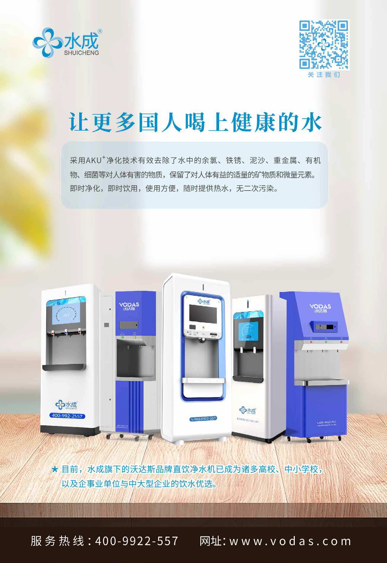 水成致力于解決工廠、企業(yè)、學(xué)校、醫(yī)院、辦公樓等公共場(chǎng)所及家庭生活健康飲用水問(wèn)題,推出了一系列公用終端直飲水機(jī)和家庭凈水器,旗下“沃達(dá)斯”牌商用直飲凈水機(jī)已在諸多知名高校、中小學(xué)校、企事業(yè)單位等公用場(chǎng)所安裝使用,并受到了廣泛好評(píng)。