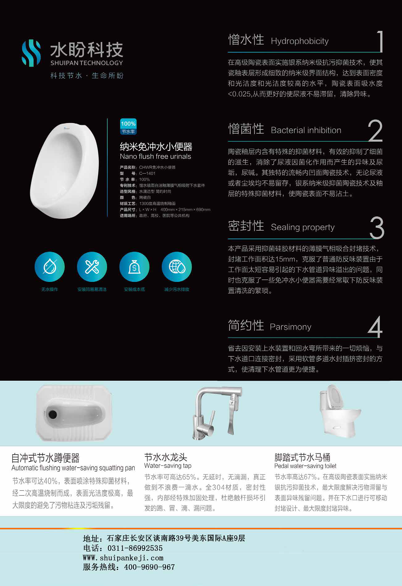 公司主要在售產(chǎn)品為我公司自主研發(fā)的“免沖水小便器”“自閉式接水龍頭”“超級節(jié)水馬桶”“智能蹲便器”我們一直致力于公共機(jī)構(gòu)衛(wèi)生間的節(jié)水工作,產(chǎn)品均是基于能簡勿繁、操作簡單、維護(hù)簡便、重物理原理而輕電子設(shè)備等原則而研發(fā)的。作為中國衛(wèi)生間節(jié)水管理領(lǐng)域的重要推動者,水盼科技一直致力于衛(wèi)生間節(jié)水方面的合同節(jié)水管理模式的探索與實踐。我們堅持“想客戶之所想,用科技的力量為客戶單位節(jié)約下每一滴可節(jié)約的水”的服務(wù)理念,運用多種合同節(jié)水管理模式為每一位有節(jié)水需求的客戶帶去量身打造的節(jié)水方案。水盼科技愿與社會各界攜手并進(jìn),共同努力,一起守護(hù)我們地球上的每一滴水。